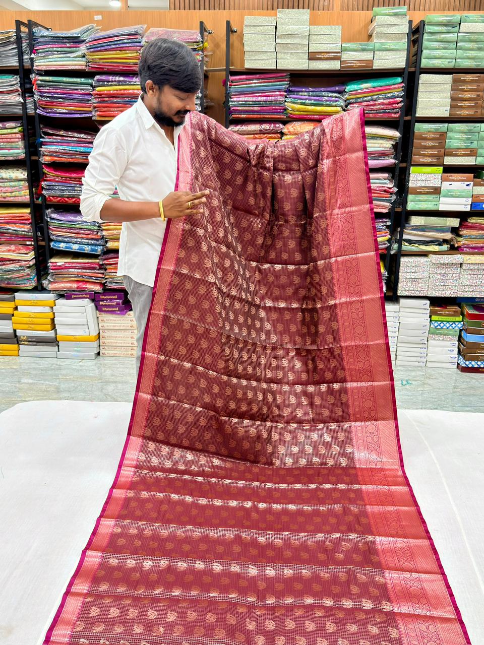 Experience timeless elegance with this Pure Marshmallow Georgette saree, featuring the intricate Rungkat design. Crafted...